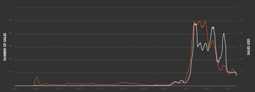 Также спад замечен и по объему торгов на NFT-маркетплейсах. Если в январе на OpenSea наторговали почти на $5 млрд, то в августе показатель обрушился до $501 млн. Кроме того, снизился и объем операций. В декабре 2021 года на NFT-рынке зафиксировали чуть более 5 млн сделок, но в августе 2022 года этот показатель едва превысил 1 млн.