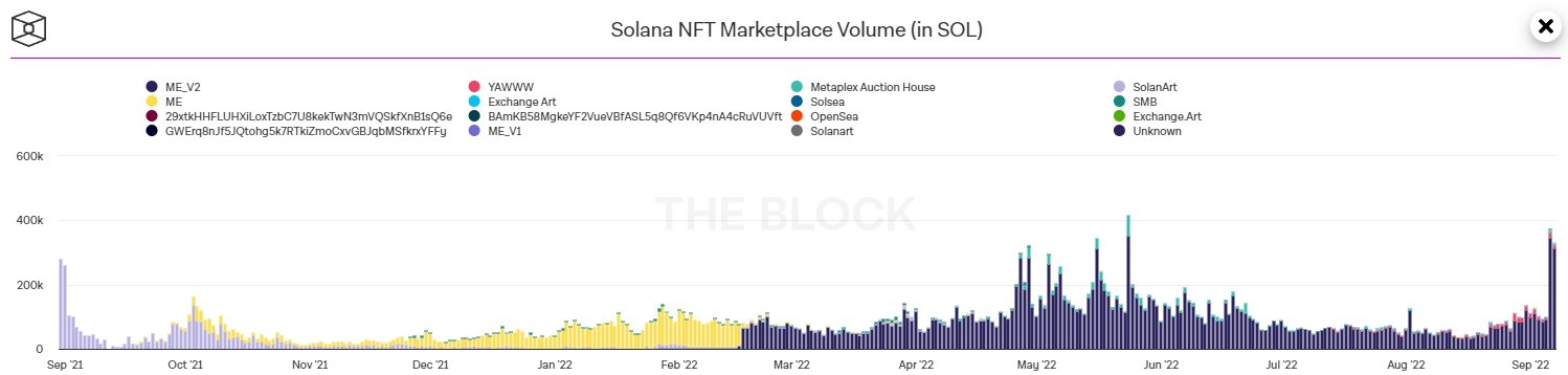 Несмотря на общее охлаждение рынка, количество выпущенных на блокчейне Solana невзаимозаменяемых токенов (NFT) резко выросло. 7 сентября показатель достиг 312 000, сообщили аналитики The Block.