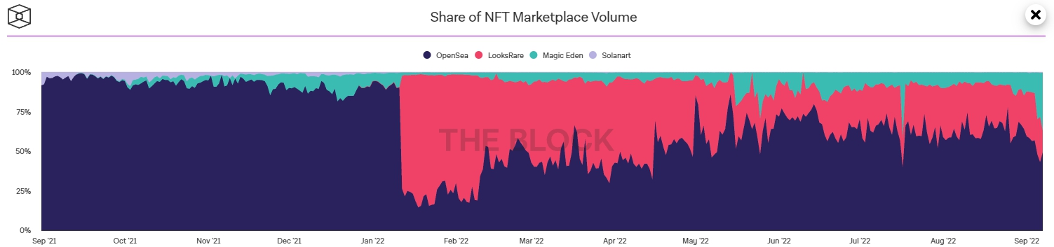 На этом фоне в совокупном рейтинге маркетплейсов крупнейшая в сети NFT-платформа Magic Eden с начала месяца нарастила рыночную долю. Показатель увеличился с 12% до 36,6% (на 7 сентября).