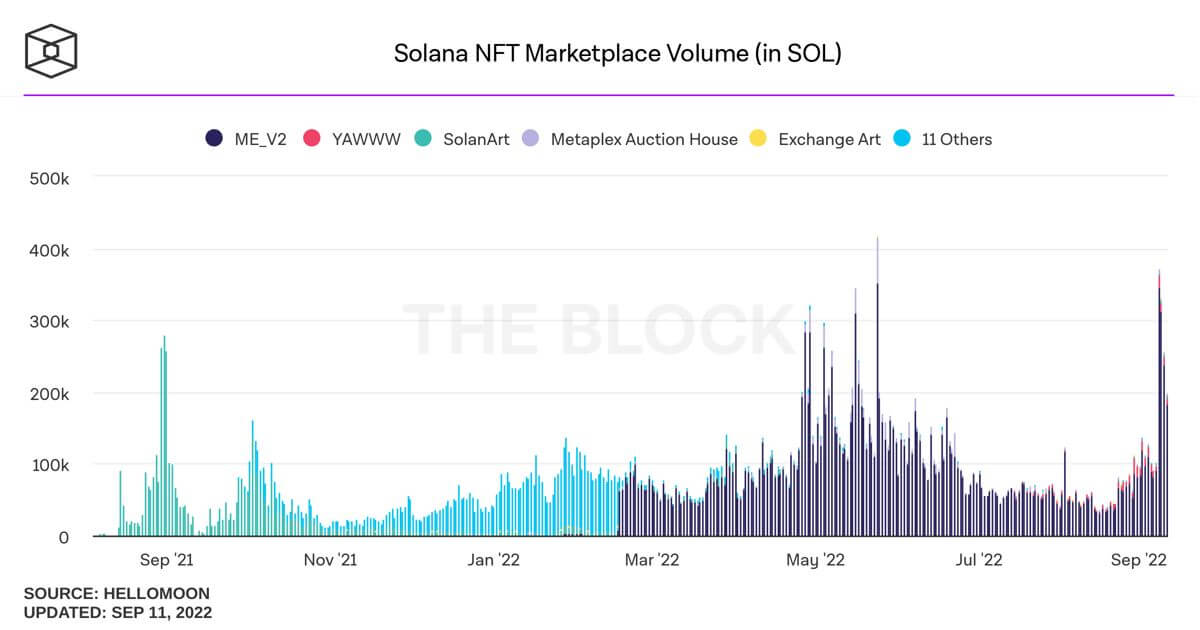 За этот период выросли и общие объёмы продаж NFT на базе Solana — 6 сентября они достигли $11,5 млн, самого высокого уровня с мая. Доля Magic Eden, которая была запущена как торговая площадка исключительно для NFT Solana, выросла с 12% в начале сентября до 36,6% по состоянию на 7 сентября.