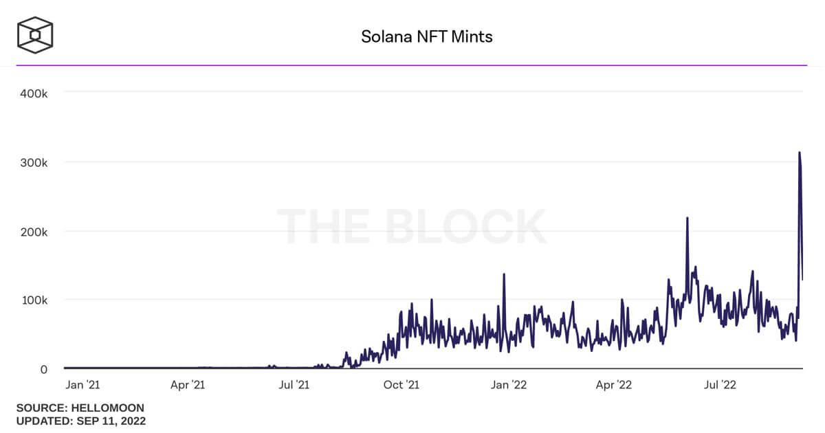Аналитические данные Block Research показывают, что 7 сентября количество новых NFT, выпущенных на блокчейне Solana, достигло 312 000. Эта цифра представляет собой значительный рост по сравнению с 39 000 новыми токенами, выпущенными на 4 сентября.