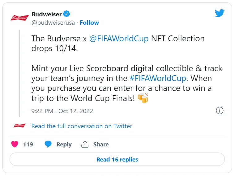 Что произошло? 14 октября пивной бренд Budweiser совместно со спортивной ассоциацией FIFA выпустил NFT-коллекцию Budverse x FIFA World Cup. Коллекция включает в себя NFT-экран, который дает возможность пользователям выбирать команды в рамках ЧМ-2022, а также отслеживать их продвижение в реальном времени на протяжении всего чемпионата. Представители Budweiser упомянули, что у покупателей токенов появится шанс выиграть поездку на финал чемпионата мира.