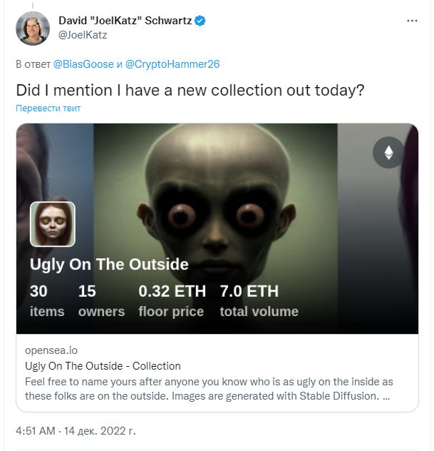 Сначала технический директор Ripple выпустил эту коллекцию под псевдонимом Джоэл Кац, но потом решил поделиться ею с людьми от своего имени. Шварц намекал на то, что потенциальные владельцы любого из этих NFT смогут назвать их в честь знакомых им людей.