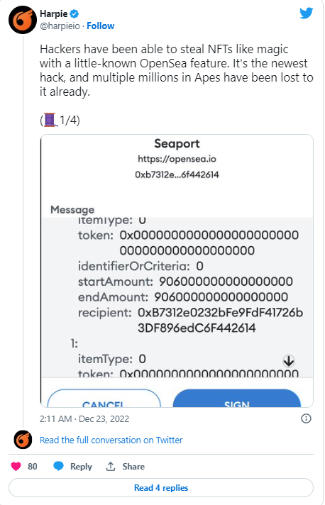 Эта уловка и фишинговая кампания, отмечает Harpie, привели к переводу NFT Bored Apes Yacht Club на миллионы долларов с популярного рынка NFT OpenSea.
