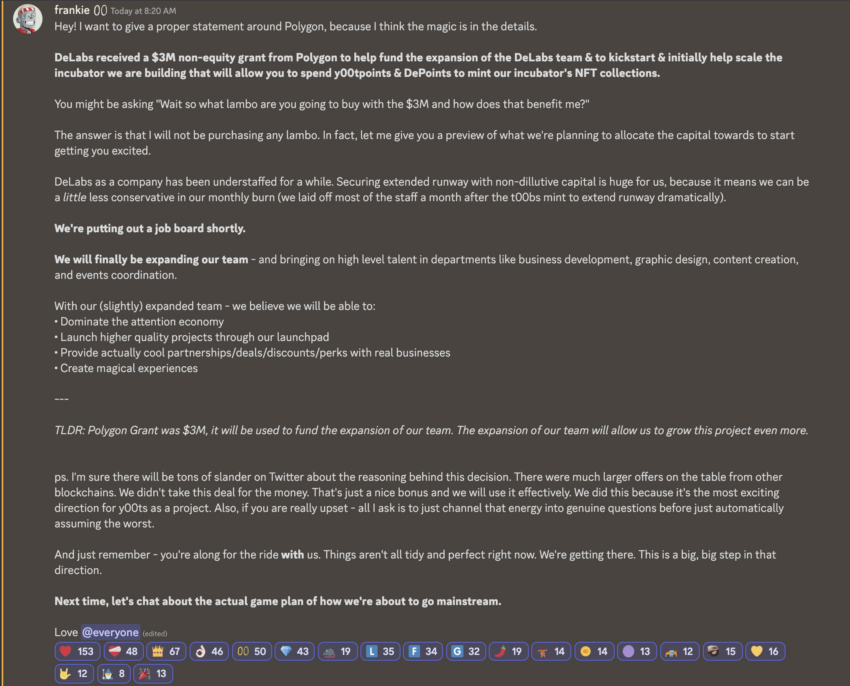 В своем новом заявлении основатель y00ts и DeGods утверждает, что команде предлагали и большие суммы, но она все равно решила сотрудничать с Polygon. Фрэнк также попытался упредить критику, которая может возникнуть в связи с раскрытием полученной компенсации: