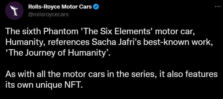 Английский производитель премиальных автомобилей Rolls-Royce Motor Cars выпустит шесть эксклюзивных автомобилей (а также ограниченное количество NFT-копий авто). Об этом компания сообщила у себя на странице в твиттере.