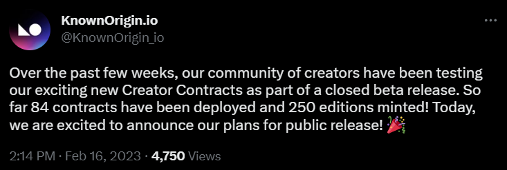 Начиная с 24 февраля верифицированные площадкой художники смогут получать выплаты с перепродаж. Для этого им понадобится развернуть собственный смарт-контракт на KnownOrigin. Пользователи смогут сделать это с помощью функции Creator Contracts, которая не требует знаний языка программирования Solidity, отметили в KnownOrigin. Впрочем, какой процент в виде роялти с перепродаж будет поступать художникам, не уточняется.