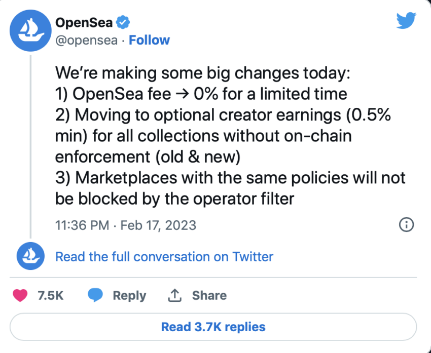 Чтобы привлечь пользователей, OpenSea временно отменил комиссии и перешел на новую модель «опционального сбора» роялти. Кроме того, маркетплейс позволил создателям контента размещать коллекции в листинге других NFT-платформ. В компании подчеркнули, что на решение повлияла позиция Blur, глава которого ранее призывал бойкотировать OpenSea.