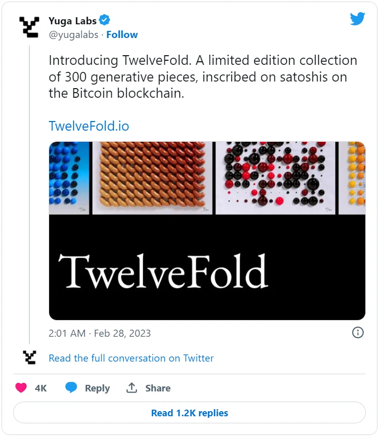 Что произошло? 28 февраля компания-разработчик NFT-коллекции Bored Ape Yacht Club (BAYC), Yuga Labs, объявила о запуске нового проекта на основе протокола Ordinal в сети Bitcoin, позволяющего создавать невзаимозаменяемые токены. Коллекция под названием TwelveFold состоит из 300 генеративных художественных NFT, которые являются «визуальной аллегорией картографии данных на блокчейне биткоина». Подробная информация о продажах будет опубликована позже на этой неделе.