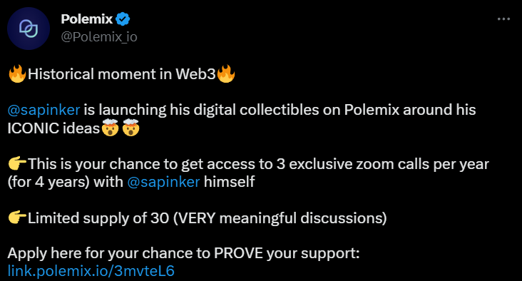Также на продажу выставят «золотые NFT» при ценнике в $50 000. Владельцы таких токенов смогут фактически участвовать в семинаре и обсуждать с Пинкером тематику докладов. Токены можно перепродать на вторичном рынке, однако неясно, сохранится ли у новых владельцев право посещать семинары. Распродажа запланирована на 14 марта на Polemix.