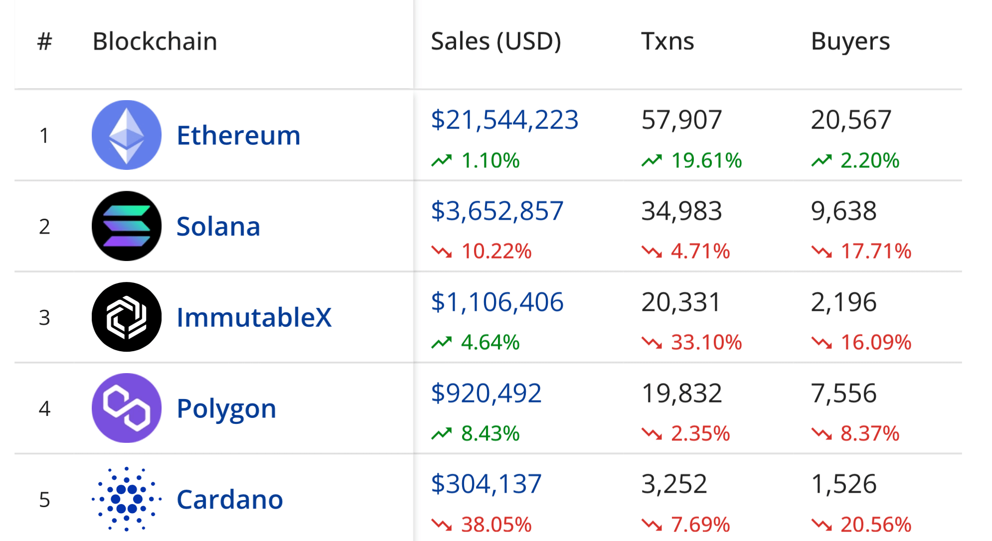 Мы проверили происходящее с NFT на выходных. Наиболее популярным блокчейном для NFT-сделок за последние сутки по-прежнему остаётся Эфириум, на который приходится эквивалент 21.5 миллиона долларов в торговых операциях. Второе место приходится на Солану с результатом в 3.6 миллиона. Соответственно, торговые объёмы с уникальными токенами даже сейчас исчисляются десятками миллионов долларов.