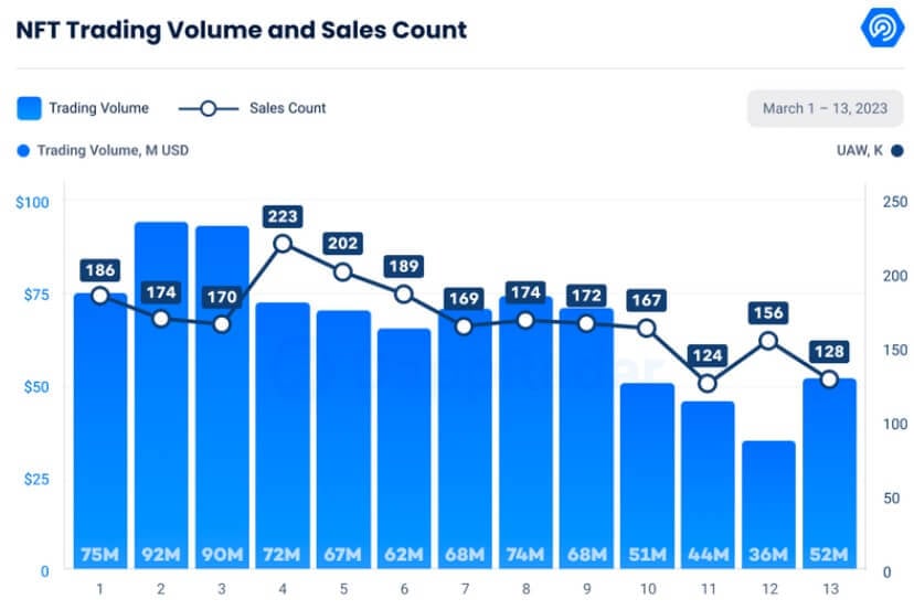 По данным аналитической платформы DappRadar, торговые объёмы уникальных токенов колебались в пределах от 68 до 74 миллионов долларов в сутки за некоторое время до коллапса Silicon Valley Bank. Уже через два дня после событий 12 марта объёмы торгов уникальными токенами упали до 36 миллионов долларов в сутки, сообщает Cointelegraph. Обвал сопровождался снижением количества сделок с NFT на 27.9 процентов в сутки в период с 9 по 11 марта.