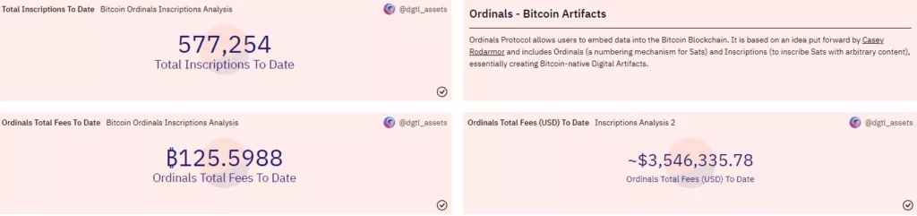 Суммарно с момента запуска протокола Ordinals в январе пользователи выпустили более 577 000 биткоин-NFT и заплатили за это 125,6 BTC (~$3,6 млн) комиссий.