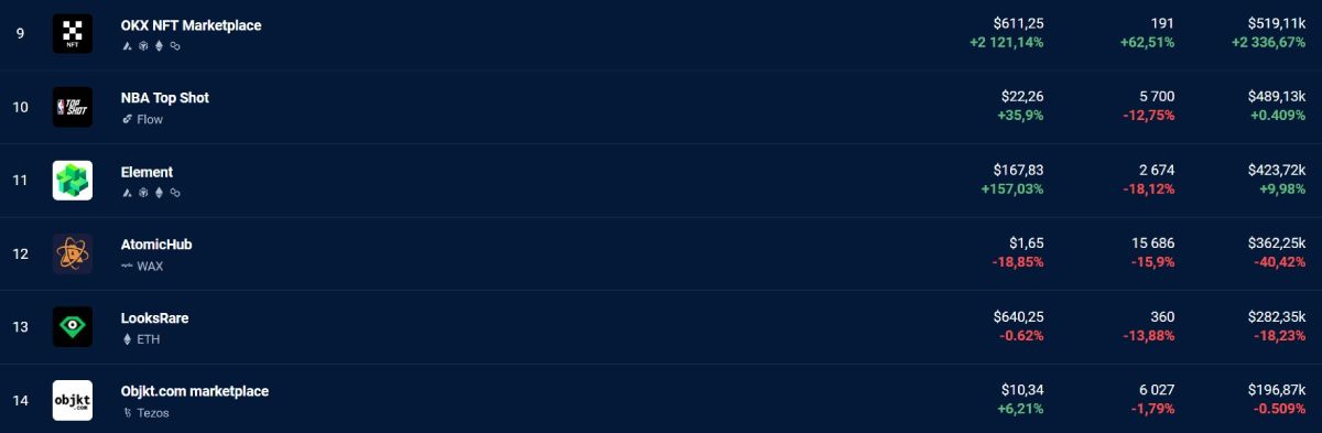 Выход новой версии LooksRare пока не принёс позитивных результатов для площадки. За последние семь дней объём торгов на рынке упал на 18% и составил лишь $ 282 350. По этому показателю платформа занимает 13-е место в рейтинге наиболее популярных маркетплейсов.