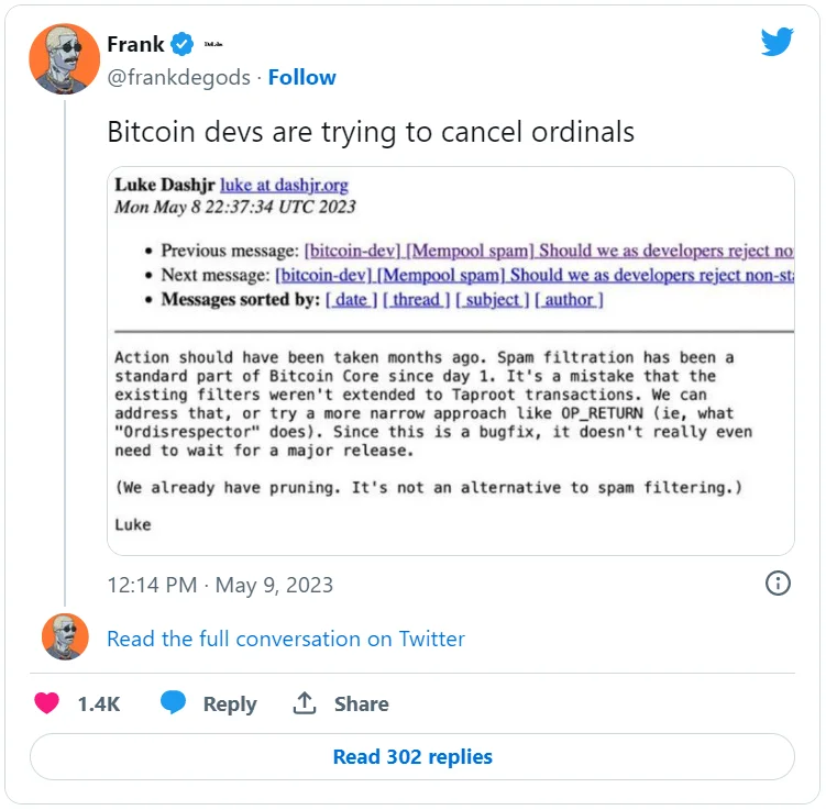 Что произошло? Ведущий разработчик ядра Bitcoin Люк Дашжр призвал криптовалютное сообщество запретить невзаимозаменяемые токены (NFT), выпущенные на основе стандарта BRC-20 в сети биткоина. По мнению Дашжра, такие NFT перегружают сеть спамом. В качестве одной из мер противодействия он предложил внести изменения в спам-фильтр блокчейна, добавив в него Taproot-транзакции.