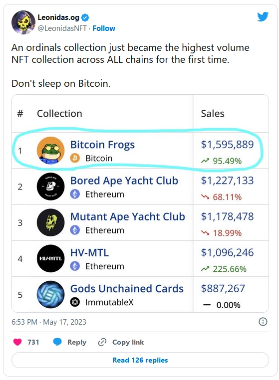 Что еще известно? В апреле объем торгов токенами Bitcoin Frogs составлял лишь $52 000, а уже в мае суммарный показатель с начала месяца превысил 6,6 млн. Разработчик блокчейн-эксплорера для токенов стандарта BRC-20 Ord.io под ником Leonidas.og заявил в Twitter, что NFT-коллекция, созданная с помощью протокола Ordinals в сети Bitcoin, стала самой крупной по всем блокчейнам впервые в истории.
