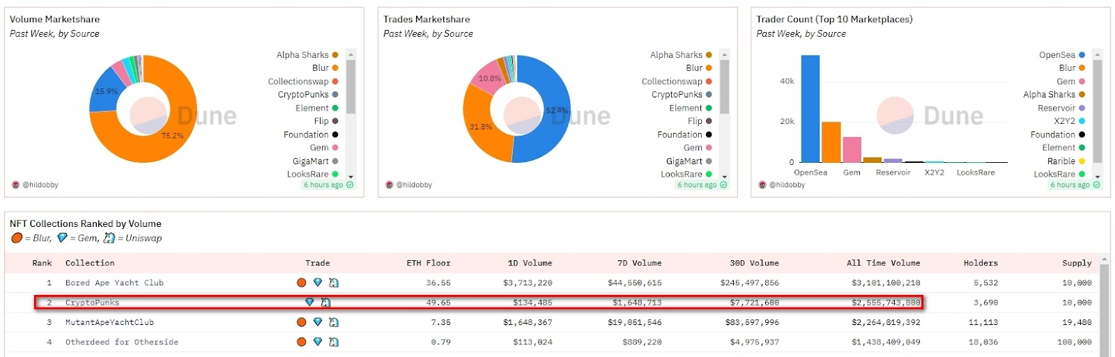 По данным дашборда на Dune Analystics, объем торгов оригинальными CryptoPunks за последние семь дней составил почти $1,65 млн. За этот период только на OpenSea сумма сделок с NFT превысила $26,29 млн, у Blur показатель достиг ~$124,5 млн.