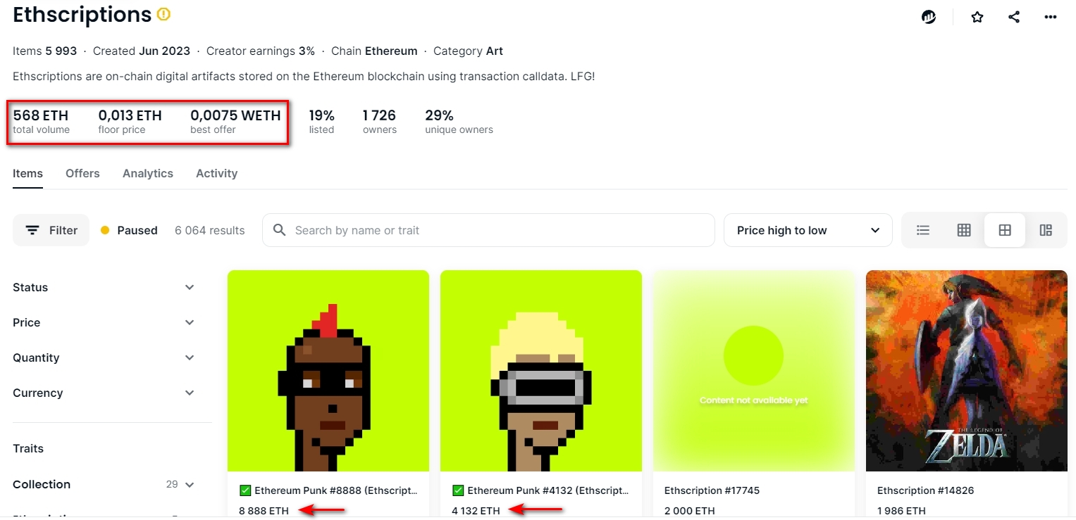 Через неделю после запуска протокола Ethscriptions для выпуска цифровых артефактов на Ethereum по аналогии с Ordinals в сети биткоина торговый объем активами превысил 560 ETH (~$1 млн), согласно OpenSea.
