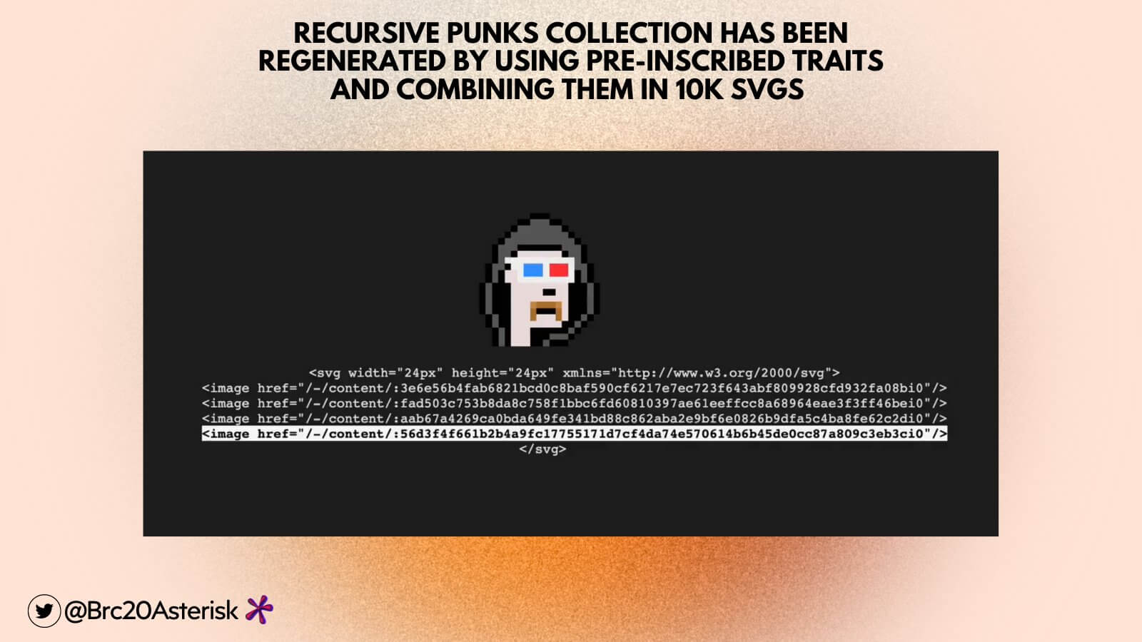 Гениальность BRC-69 заключается в его простоте. Благодаря рекурсивным надписям майнерам нужно внести всего одну строку текста вместо полного изображения. Этот текст позволяет автоматически выводить конечное изображение, используя исключительно ресурсы блокчейна.