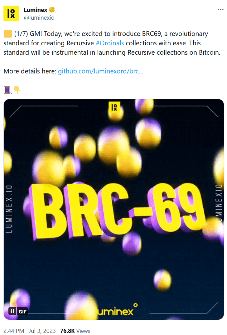 На странице BRC-69 в GitHub утверждается, что новый стандарт уже сократил использование ресурсов примерно на 90 процентов. В целом токены BRC-69 разработаны командой Luminex. У себя в Твиттере они объяснили процесс внесения новой картинки в блокчейн с помощью следующей цитаты.