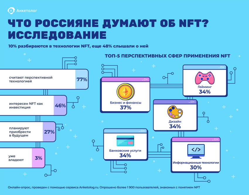 Сомнительная торговая динамика на рынке невзаимозаменяемых токенов (NFT) не поменяла мнение россиян о технологии. К такому выводу пришел сервис онлайн-опросов «Анкетолог», опросив чуть менее 2000 респондентов.