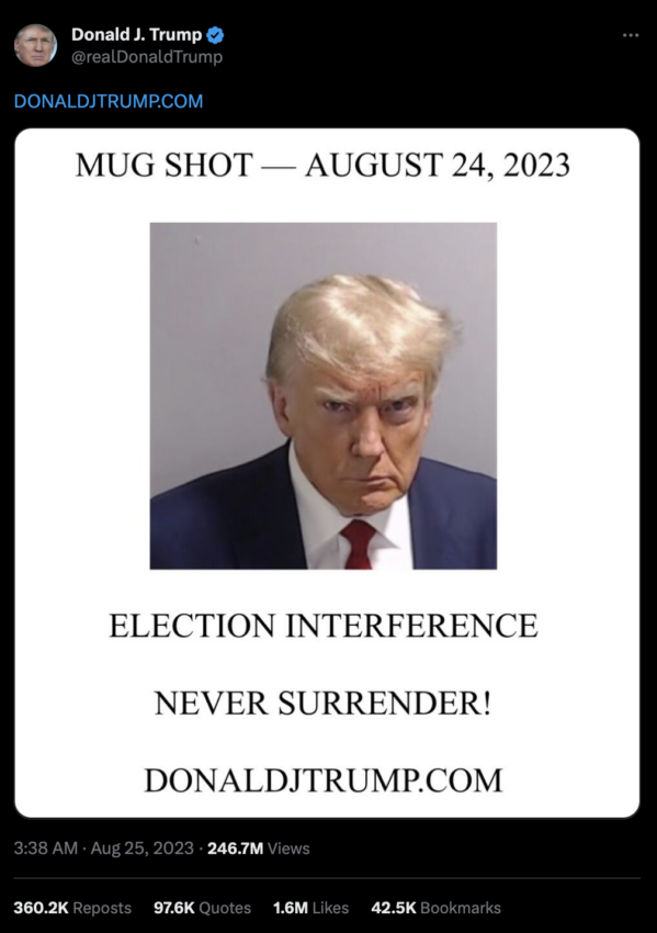 24 августа Дональд Трамп явился в офис шерифа округа Фултон в рамках рассмотрения уголовного дела в штате Джорджия по обвинению в попытке манипулировать волей избирателей на выборах 2020 года. На следующий день бывший президент США опубликовал в соцсети первый с января 2021 года твит, прикрепив к нему сделанный в участке снимок.