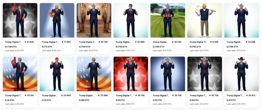 Количество продаж NFT из коллекции Трампа, тем временем, взлетело на 155% — до 237, а минимальная цена подскочила на 52% и на момент написания составляет 0,1797 ETH.