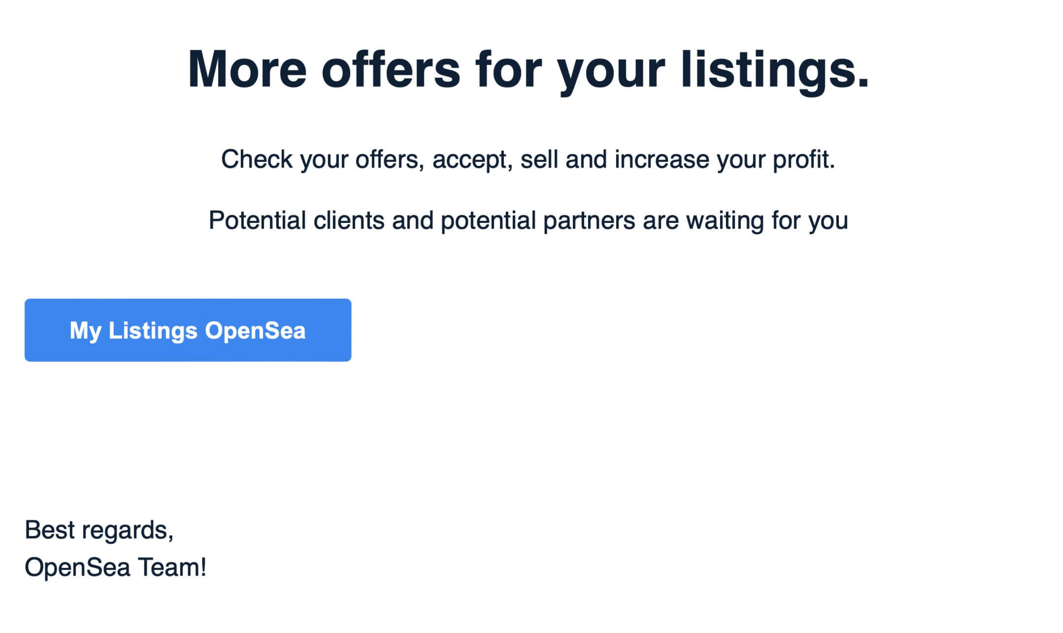 Мы тоже столкнулись с подобными письмами. В нашем случае мошенники сообщали о якобы новом предложении для покупки уникальных токенов, предлагая перейти по ссылке. Скорее всего, скамеры таким образом хотели получить данные для авторизации на платформе ради последующей кражи NFT. Вот как выглядело письмо мошенников.