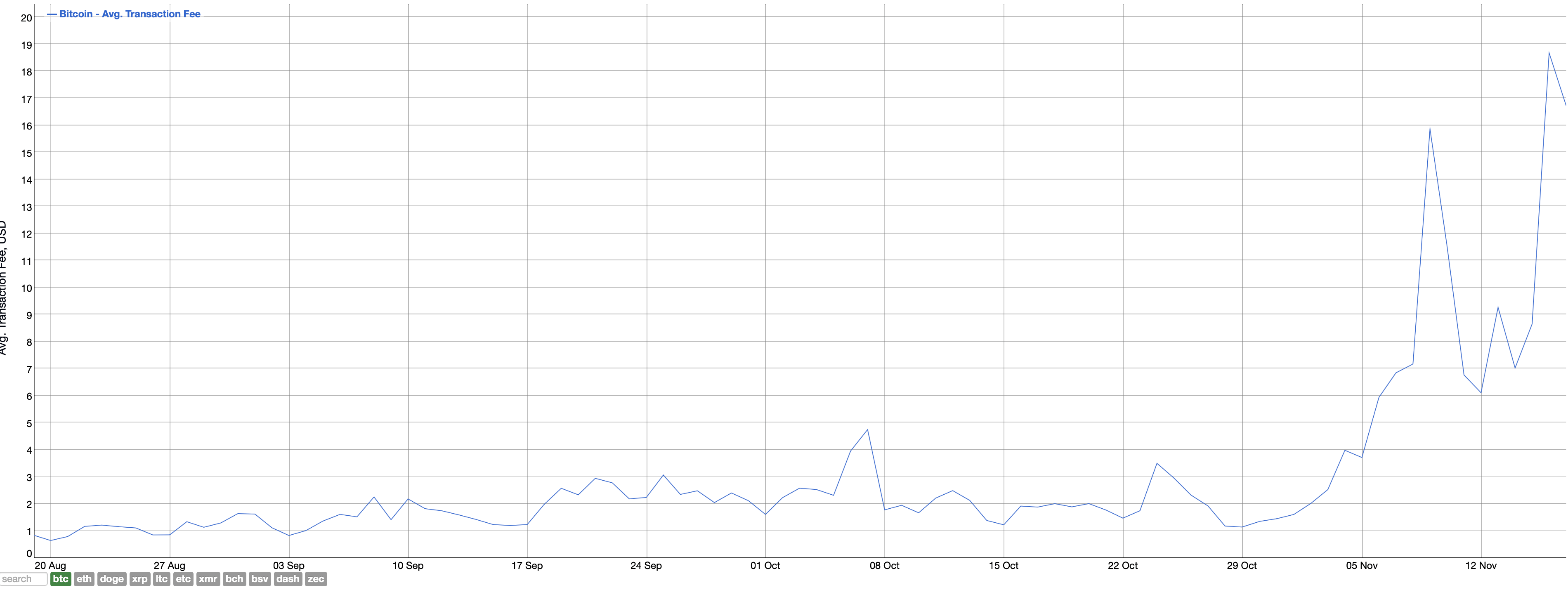 Вчера средняя стоимость проведения операций в сети Биткоина составила 16.7 доллара. Вот соответствующий график показателя за три месяца.