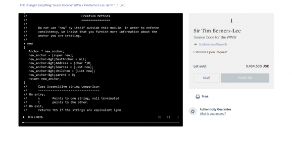 Летом прошлого года разработчик Тим Бернерс-Ли на аукционе Sotheby’s продал NFT-токен с исходным кодом протокола WWW (World Wide Web). Торги начинались с $1 тыс. Итоговая стоимость лота составила $5,4 млн. Бернерс-Ли заявил, что направит полученные деньги на реализацию собственных инициатив.