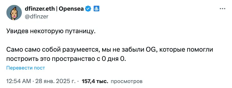 В ответ на негативную реакцию Финзер заявил, что OpenSea не забыла про «OG», которые помогли создать платформу, хотя он и не предоставил дополнительных подробностей.
