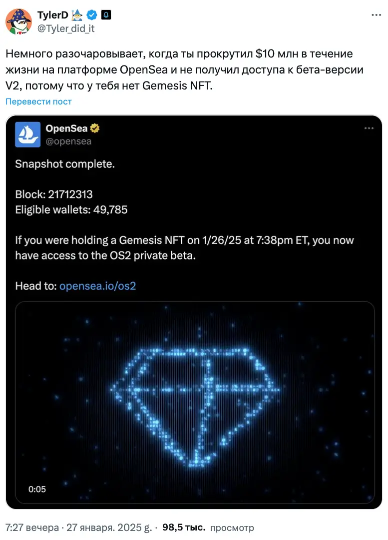 28 января торговая площадка NFT сообщила, что завершила создание снимка кошельков с NFT Gemesis. Компания опубликовала информацию о том, что коллекция NFT насчитывает почти 50 000 держателей, заявив, что теперь эти пользователи могут получить доступ к OS2.
