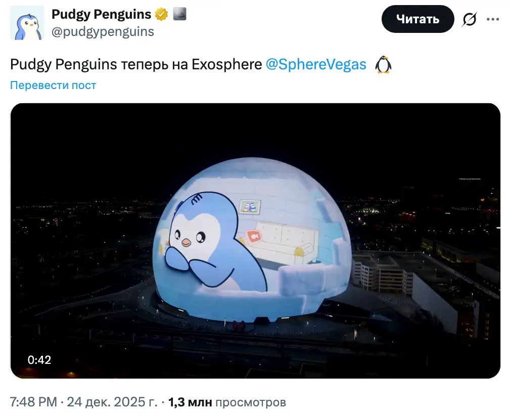 В публикации в соцсети X проект Pudgy Penguins сообщил, что анимация стартовала в канун Рождества на внешней поверхности Las Vegas Sphere. Это популярная площадка в форме купола, покрытая LED‑панелями высокого разрешения. Они предназначены для отображения масштабных визуальных эффектов, которые видны на всем Лас‑Вегас‑Стрип.
