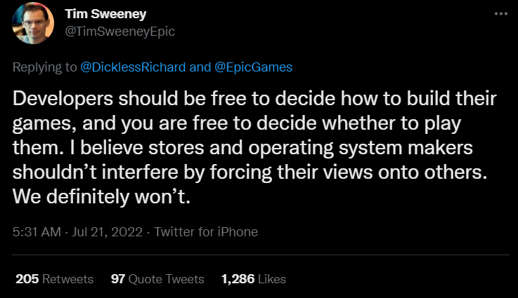 Epic Games не будет запрещать разработчикам видеоигр внедрять технологии невзаимозаменяемых токенов (NFTs) или блокчейн. Об этом у себя в твиттере сообщил генеральный директор Epic Games Тим Суини.