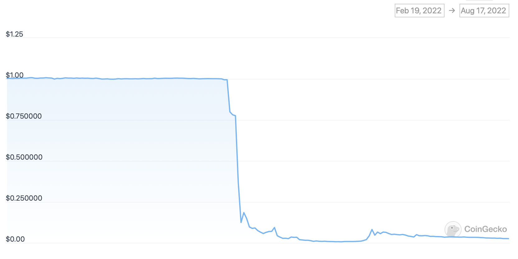 «Стейблкоин» TerraClassicUSD (USTC) оценивается в 2 цента, хотя монета должна стоить 1 доллар.