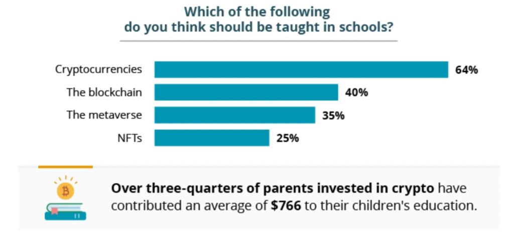 В частности, 884 американских родителя и 210 выпускников американских колледжей (64% и 67% соответственно) согласны с тем, что криптовалюты должны стать частью обязательного образования.