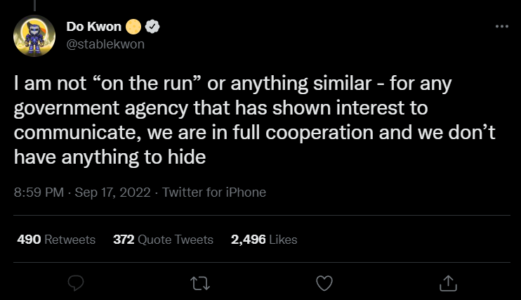 В то же время прокуратура Южной Кореи в комментарии изданию Yonhap News Agency заявила, что Квон «очевидно в бегах» и не сотрудничает со следствием. Источники в правоохранительных органах Южной Кореи отмечают, что Квон еще в августе дал понять через своих юридических представителей, что не намерен сотрудничать с прокуратурой и давать показания. Сейчас власти Южной Кореи пытаются установить местонахождение главы Terra.