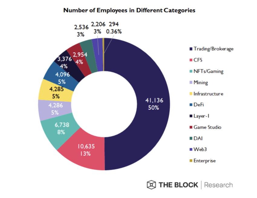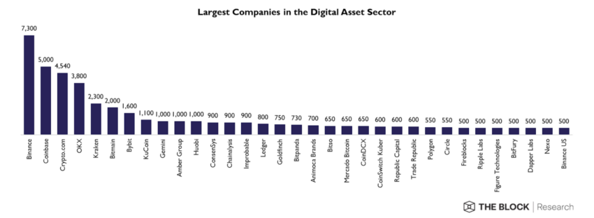 Однако, несмотря на замедление роста в сфере NFT, этот сектор по-прежнему занимает третье место по занятости с 6 738 рабочими местами или 8% от всего рынка труда в криптоиндустрии. Что касается крупных работодателей, в отрасли доминируют криптовалютные биржи. У крупнейшей из них, Binance, в штате 7300 сотрудников; далее следует Coinbase.