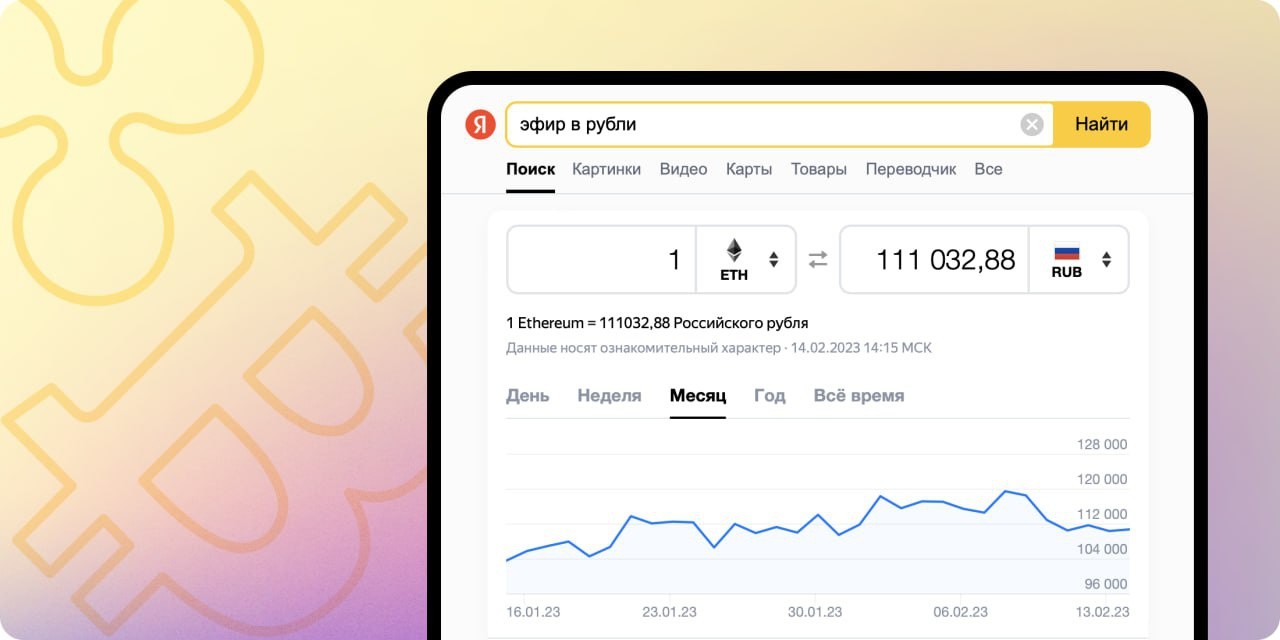 Виджет с графиком курса и инструментом для быстрой конвертации располагается прямо над результатами поиска. По текстовым запросам сервис понимает, что конкретно ищет пользователь. Если набрать «эфир в рубли», то поиск выдаст конвертер Ehereum в рубли. При обработке запроса учитывается сленг, например, «обменять битки».