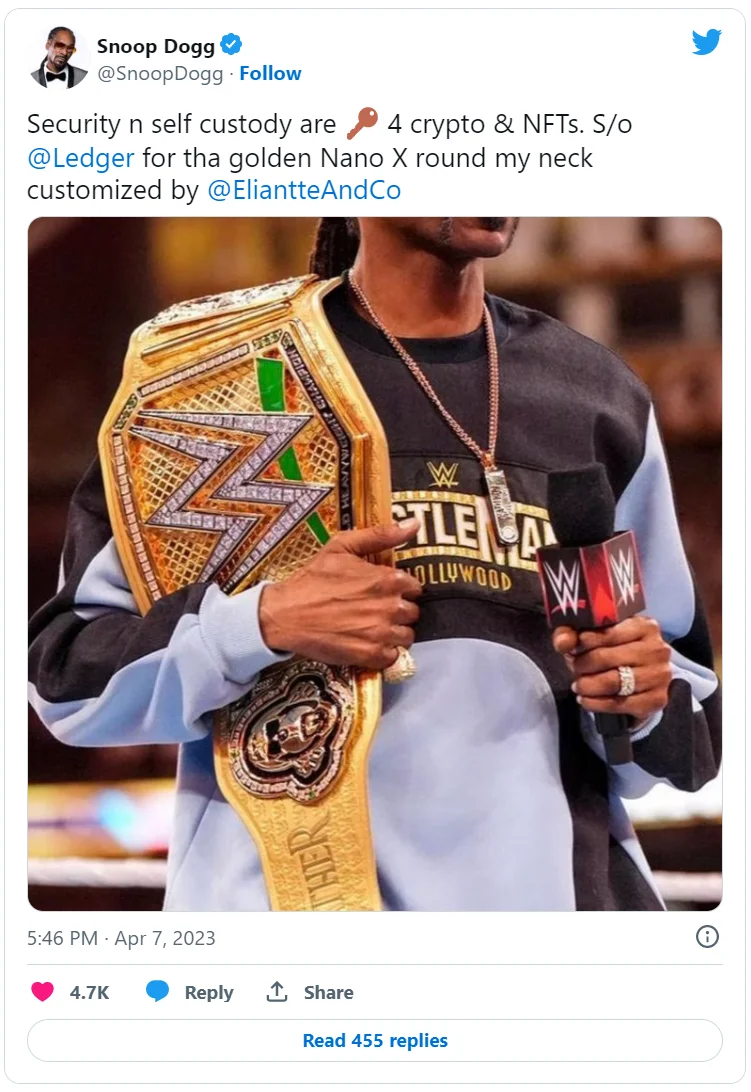 Что произошло? 1-2 апреля рэпер Snoop Dogg провел мероприятие рестлинг-промоушена WWE, Wrestlemania 39, на котором продемонстрировал золотой аппаратный криптокошелек Ledger Nano X. Устройство создано ювелирами Eliantte & Co. по индивидуальному заказу и инкрустировано драгоценными камнями. На корпусе кошелька выгравировано название лейбла Death Row Records, владельцем которого является Snoop Dogg. Хип-хоп исполнитель написал в своем Twitter-аккаунте, что безопасность и самостоятельное хранение являются основой для криптовалют и невзаимозаменяемых токенов (NFT).