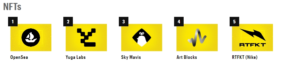 В секторе NFT рейтинг возглавил маркетплейс OpenSea. За ним расположилась студия Yuga Labs, стоящая за популярной коллекцией Bored Ape Yacht Club. В основном эксперты учитывали объем торговли и комиссионных сборов, где это применимо.