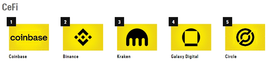 Категорию CeFi возглавила Coinbase, на втором месте оказалась Binance — единственная в пятерке неамериканская фирма.