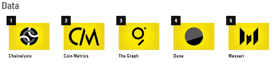 В категории поставщиков данных и блокчейн-аналитики список возглавила фирма Chainalysis. За ней расположились Coin Metrics и The Graph. Основными критериями выступили объем привлеченного финансирования, численность персонала и репутация в СМИ.