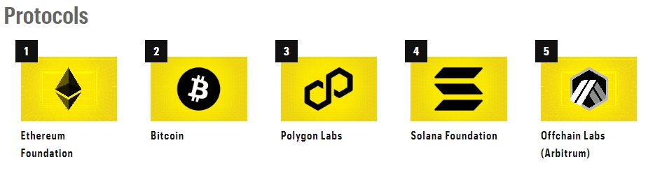 Эксперты Fortune отметили, что в категории протоколов пришлось брать во внимание децентрализацию, поскольку многие криптопроекты, включая биткоин, не управляются единой организацией. Издание оценивало лаборатории, фонды, компании и другие стоящие за блокчейном структуры. Основные показатели включали связанный с сетью совокупный доход, объемы и активность, а также безопасность.