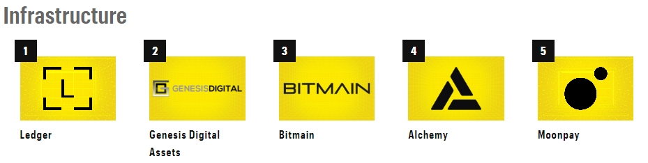 В число участников категории инфраструктурных проектов были включены майнинговые компании, производители оборудования и разработчики ПО. Для попадания в список фирмы должны обладать рыночной капитализацией не менее $400 млн или привлечь аналогичную сумму.