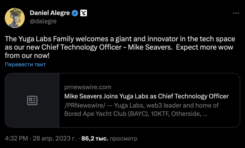 В Yuga Labs заявили, что наняли его за его проверенный опыт в продвижении организаций к следующему этапу роста: