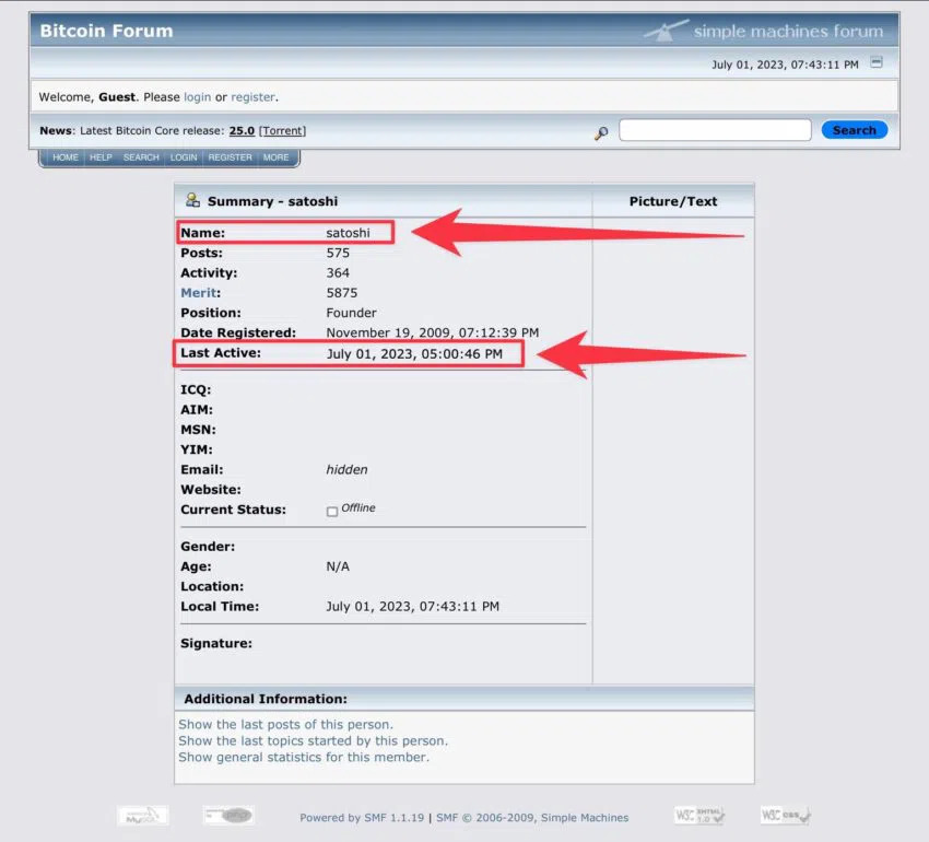 2 июля в Твиттере появились сообщения о том, что Сатоши Накамото вышел на связь. Подовом стала активность в учетной записи разработчика на форуме bitcointalk. Участники криптосообщества обнаружили, что в его профиле изменилась дата последнего посещения — якобы он выходил в онлайн 1 июля 2023 года.