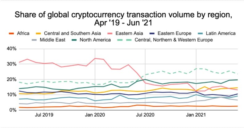 Доля объёма криптовалютных транзакций по регионам.