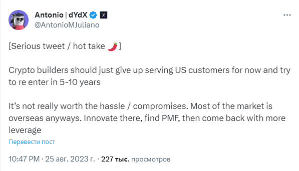 На своей странице в социальной сети X* Антонио Джулиано, у которого имеется 49 400 подписчиков, заявил, что неопределённость регулирования в Соединённых Штатах не стоит хлопот или компромиссов.