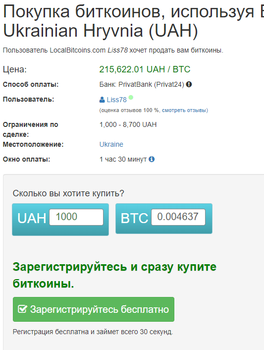 Аналогично скриншот из LocalBitcoins — 0.004637 BTC. Это лучший результат из всех. Скриншоты сделаны примерно в момент обмена фиата на BTC на Бинансе.